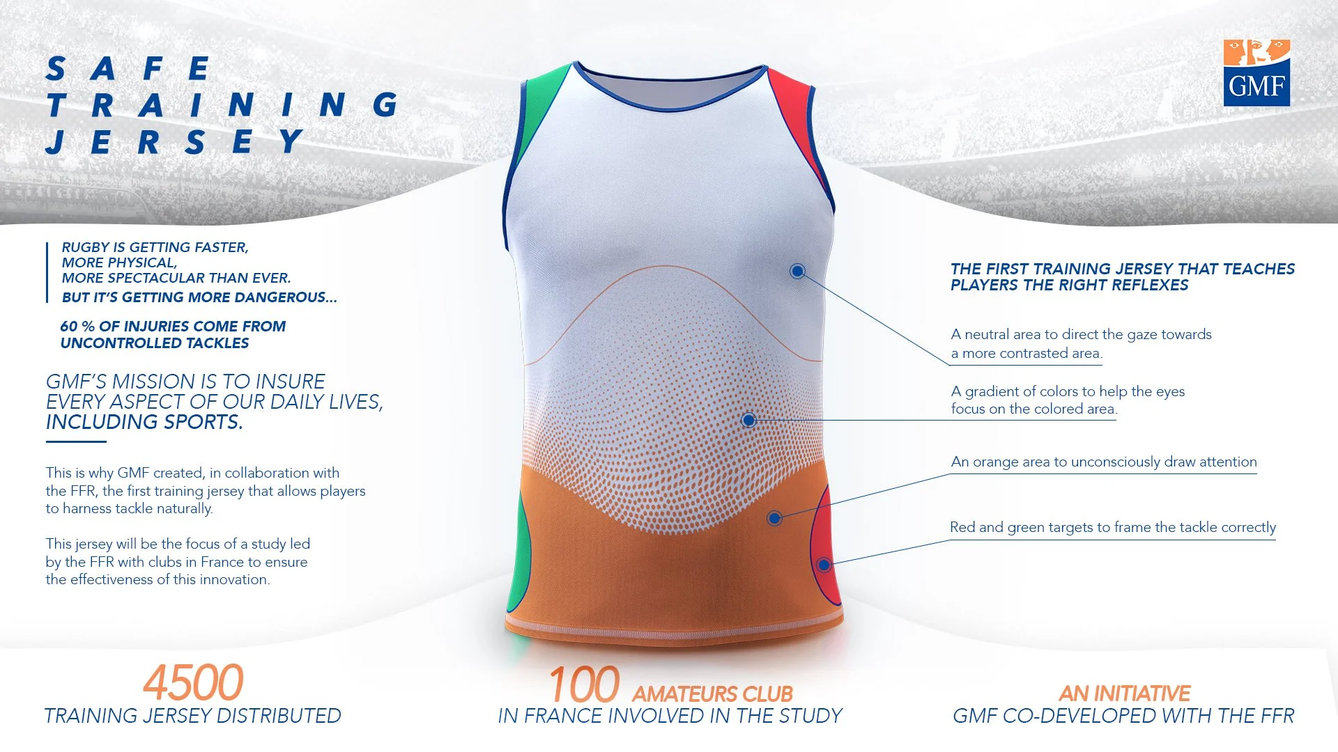 Chaque année, de plus en plus de joueurs de rugby sont victimes de commotions. Des blessures traumatisantes qui peuvent mener à la mort. Souvent, ces blessures sont dues à des plaquages mal maîtrisées et pourraient être évitées en apprenant des gestes plus sûrs. C’est pourquoi, GMF, l’assureur historique du rugby français, en collaboration avec France Rugby, a développé la chasuble de plaquage faite pour apprendre les bons gestes.