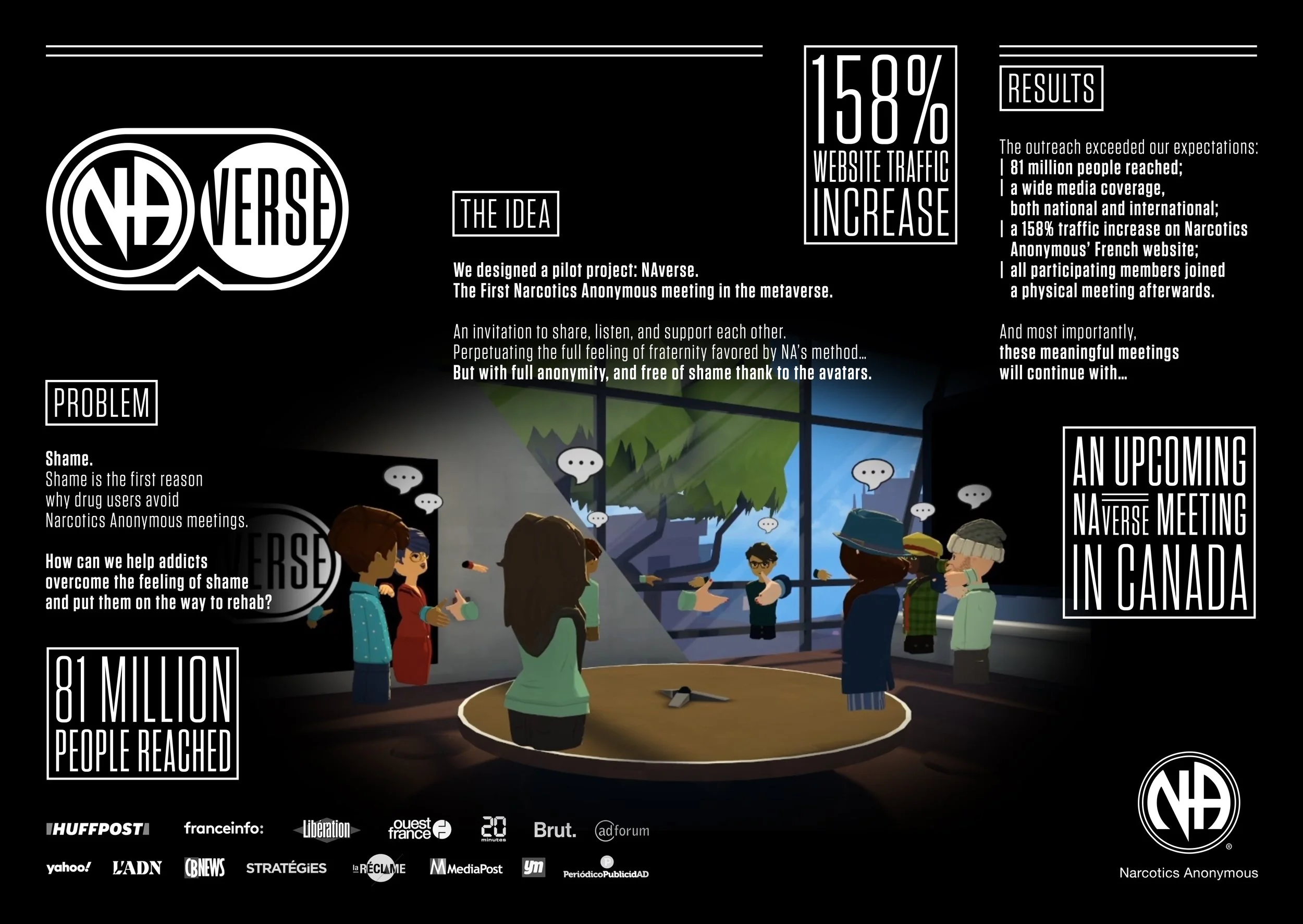 Les addicts ont souvent honte de franchir la porte des réunions physiques des Narcotiques Anonymes. Pourtant, lorsqu’ils y ont goûté, la plupart y prennent goût et finissent par arrêter ou réduire leur consommation. L’enjeu principal de l’association Narcotiques Anonymes est donc de faire en sorte que les addicts se lancent… Nous avons donc créé un projet pilote permettant aux narcotiques d’expérimenter une première réunion là où on peut être soi même sans trop se révéler : le metaverse.